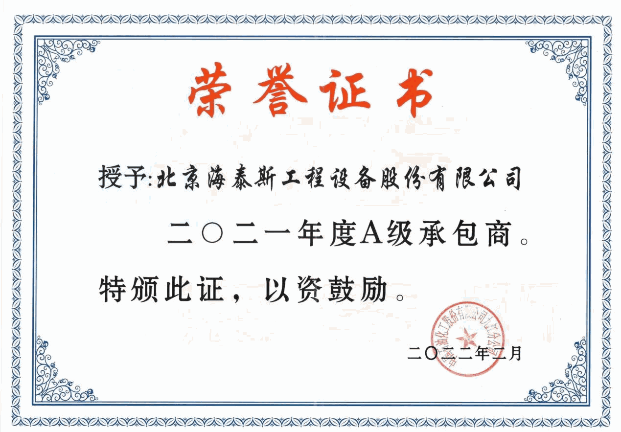 海泰斯獲評(píng)“A級(jí)承包商”榮譽(yù)稱號(hào)